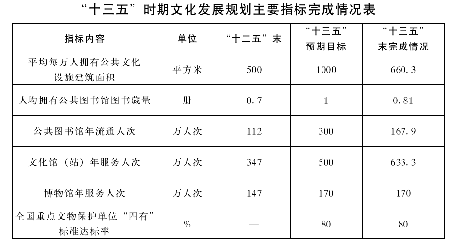 ———文化事業(yè)繁榮發(fā)展。全省藝術(shù)創(chuàng)作水平持續(xù)提升,現(xiàn)代公共文化服務(wù)更加標(biāo)準(zhǔn)化均等化,文化遺產(chǎn)保護(hù)利用水平不斷提高,文化事業(yè)在服務(wù)全省經(jīng)濟(jì)社會發(fā)展、滿足人民群眾精神文化需求、促進(jìn)社會文明程度提升等方面作用更加凸顯。