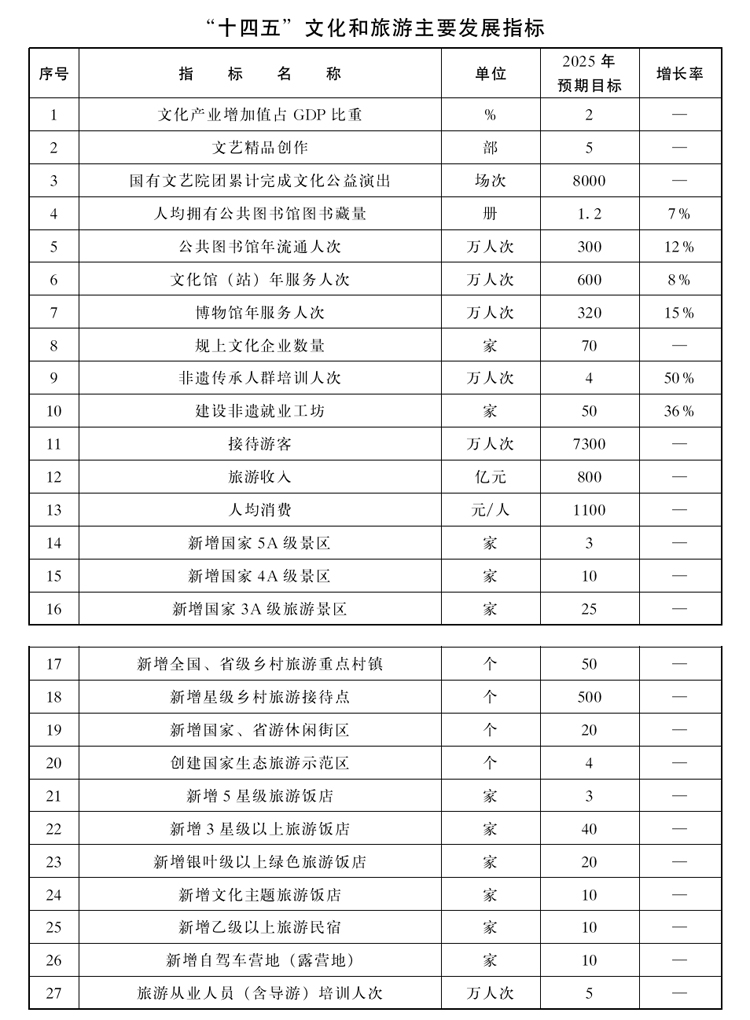 到2025年,全省文化事業(yè)、文化產(chǎn)業(yè)和旅游業(yè)發(fā)展水平不斷提升,人民群眾精神文化生活日益豐富,文化和旅游治理體系和治理能力不斷提高,文化鑄魂、文化賦能和旅游為民、旅游帶動作用日益凸顯。