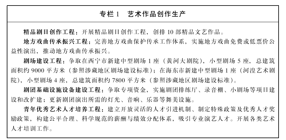 (四)推動國有文藝院團(tuán)深化改革。深化國有文藝院團(tuán)改革,出臺《青海省關(guān)于深化國有文藝院團(tuán)改革的實施意見》。以演出為中心環(huán)節(jié),激發(fā)國有文藝院團(tuán)生機(jī)活力,實現(xiàn)院團(tuán)創(chuàng)演質(zhì)量、管理水平、服務(wù)效能提升。優(yōu)化劇場供應(yīng)機(jī)制,促進(jìn)國有文藝院團(tuán)與劇場深度合作,支持團(tuán)場合作、以團(tuán)帶場或以場帶團(tuán)。加強(qiáng)對民營文藝表演團(tuán)體的支持、規(guī)范、引領(lǐng),加快推動民營文藝表演團(tuán)體高質(zhì)量發(fā)展。實施國有文藝院團(tuán)排練廳、錄音棚、小劇場等基礎(chǔ)設(shè)施建設(shè),對燈光、音響等舞美設(shè)施設(shè)備更新?lián)Q代,不斷滿足劇團(tuán)新時代發(fā)展需要。