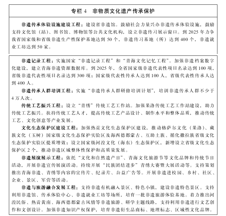 (二)強(qiáng)化非物質(zhì)文化遺產(chǎn)整體性保護(hù)。貫徹執(zhí)行《青海省非物質(zhì)文化遺產(chǎn)條例》《青海省省級文化生態(tài)保護(hù)區(qū)管理辦法》,提升國家級熱貢文化生態(tài)保護(hù)區(qū)、格薩爾文化(果洛)、藏族文化(玉樹)生態(tài)保護(hù)實驗區(qū)建設(shè)管理水平,創(chuàng)建國家級河湟文化(海東)生態(tài)保護(hù)區(qū)。持續(xù)推動省級文化生態(tài)保護(hù)實驗區(qū)建設(shè),加強(qiáng)非遺系統(tǒng)性保護(hù),持續(xù)打造“青繡”“花兒”等品牌,支持非遺融入景區(qū)、度假區(qū)、旅游休閑街區(qū)、特色小鎮(zhèn),鼓勵非遺特色景區(qū)發(fā)展,加大非物質(zhì)文化遺產(chǎn)保護(hù)傳承弘揚(yáng)力度。